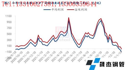 为什么废钢资源会存在阶段性偏紧?其实在第一部分中已经讨论过,废钢资源近几年内都是在每年的1月到节后的一段时间内存在着供需缺口,主要是因为废钢加工基地节前会放假,节后复工较晚导致的市场资源偏紧,无缝厚壁钢管厂家因此在这段时间内收废较为困难,今年也不例外。但今年1月份61家无缝厚壁钢管厂家的到货量同比去年有所降低(图4所示),到货量同比有所降低,分析下来大概有三方面原因:一是由于产废的制造业企业放假较早、房地产行业的走弱,使得社会加工废钢减少,外加疫情阻碍了废钢资源的流通,导致了废钢加工基地收废困难。今年1月293家样本基地库存同比降低有30万吨左右(图5所示);二是今年1月以来五大材的总产量低于去年同期(图6所示);三是电炉厂自今年1月以来普遍处于亏损的状态,利润情况要远差于去年同期(图7所示)。后面两方面原因导致了无缝厚壁钢管厂家降低了废钢消耗量,所以今年1月以来61家样本无缝厚壁钢管厂家的废钢日耗同比低于去年(图8所示),需求端的走弱联动了供应端一起走弱。所以以上三方面原因综合导致了今年1月份来无缝厚壁钢管厂家收废量不及去年同期。