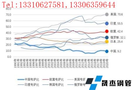 电炉钢是以电力为能源、以再生钢铁料为原料的炼钢炉生产的钢。这种短流程炼钢与以铁矿石为主要原料的长流程炼钢在原料使用上有本质的区别。从电炉钢的占比情况看,中国粗钢生产90%以上依赖长流程,即以铁矿石为主要原料的生产方式,并且受制于国产铁精矿的产量不足,对进口铁矿石的依存度很高。截止到2020年,据世界钢协(WSA)的统计数据,全球电炉钢产量占比为26.1%。主要产钢国中,美国为70.6%,土耳其为69.2%,印度电炉比为55.5%,欧盟(28)为42.4%,俄罗斯为32.1%,韩国为31.0%,日本为25.4%。中国电炉钢占比在20世纪90年代曾超过20%,但由于之后中国长流程炼钢规模迅速扩大,电炉钢占比不断被稀释,至2020年已降至9.2%。从目前情况看,美国、印度和欧盟钢铁生产对铁矿石依存度相对低很多。