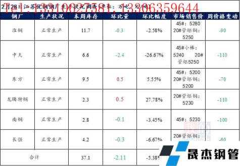 江苏优特无缝厚壁钢管厂家棒材总库存37.1万吨,较上周下降2.11万吨,环比降5.38%,较去年同期下降9.25万吨,同比降19.96%,目前江苏优特无缝厚壁钢管厂家均正常生产。