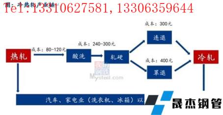 由于热轧是冷轧的原料,调研了解有近40%的热轧被用来生产冷轧,而且冷热轧终端需求分布有部分重合,因此冷轧与热轧价格走势高度类似。冷轧板卷是以热轧卷为原料,在室温下经过酸洗(费用80-120元/吨)、轧制(费用240-300元/吨),然后连退(费用300元/吨)或罩退(费用400元/吨)而成,冷轧成本较热轧多出620-820元/吨。从下游需求分布来看,冷热轧终端需求分布有部分重合,冷热轧均被用于汽车、家电业(洗衣机、冰箱)以及产业设备等。