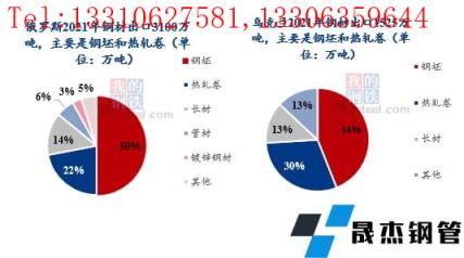 俄、乌均是产钢大国和厚壁无缝钢管主要出口国,两国主要出口产品均为钢坯、热轧卷、长材。据世界钢协统计,2021年,俄、乌粗钢产量分别为7600万吨和2140万吨,产量在全球排名第五和第十四位,分别占全球粗钢总产量的3.9%和1.1%。