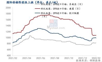 国际钢价自俄乌冲突以来迎来了阶段性上涨,截至2月28日,欧盟及东南亚进口CFR价格月环比分别上涨100美元/吨和82美元/吨,另外美国进口价格也在2月中下旬停止了下跌趋势开始企稳。