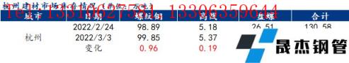 分品种来看,以杭州市场为例,本周杭州市场建筑厚壁无缝钢管总库存为130.25万吨,其中螺纹钢库存99.85万吨,周环比增加0.96万吨,增幅为0.97%;盘螺25.03万吨,周环比减少1.48万吨,降幅为5.58%;线材5.37万吨,周环比增加0.19万吨,增幅为3.67%。