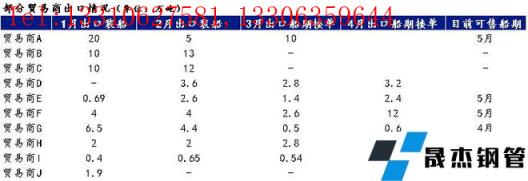 贸易商1:华北出口商。今年前两个月合计出口在1万吨左右,主要为镀锌产品,其中有部分之前延期的订单。近期海外客户对冷热系产品询单量明显增加,多数为5月船期资源,目前正积极与无缝厚壁钢管厂家及货代公司沟通,尽量满足客户提出的交货期。