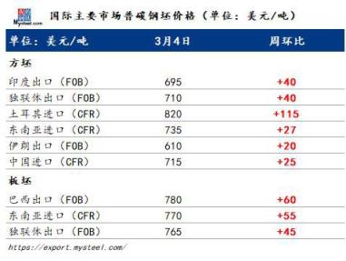 本周中东资源价格也随势上涨,据了解目前伊朗方坯价格约为610-620美元/吨FOB,较上周上涨10美元/吨。但本周伊朗出口市场较为平静,伊朗主要无缝厚壁钢管厂家之一Mobarakeh Steel完成一批板坯出口招标,中标价格为650美元/吨FOB。