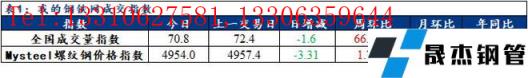 讯:全国建筑厚壁无缝钢管成交量监测,成交量相对指数来看,全国70.8减1.6,北方34.5减3.4,华东104.9减4.5,南方56.7增2.2。今日螺纹钢价格指数4954,较上一交易日减3.31。