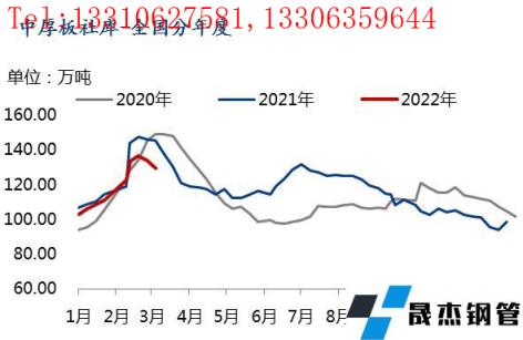 另一方面,21年四季度末无缝厚壁钢管厂家品种钢订单转好,很多无缝厚壁钢管厂家对内部品种结构进行了调整,以减少流通材,增加直供量为主,这一点也从我们节前一些品种钢价格涨幅也能看出,包括桥梁板、高建钢,Q355C, Q355D板等等,这些品种节前价格涨幅均高于普板和低合金板。所以进一步导致市场流通材的量在减少,这一点,也可以从我们今年春节后的社会库存能够得到验证。今年春节后的中板社会库存大幅低于去年同期,还有一方面原因是,今年大家冬储的意愿非常低,投机性订货量较去年有明显下降,多以协议量到货为主。