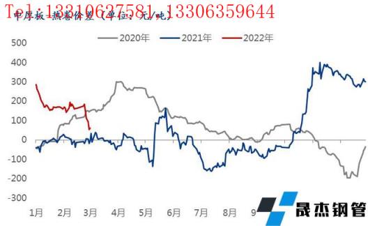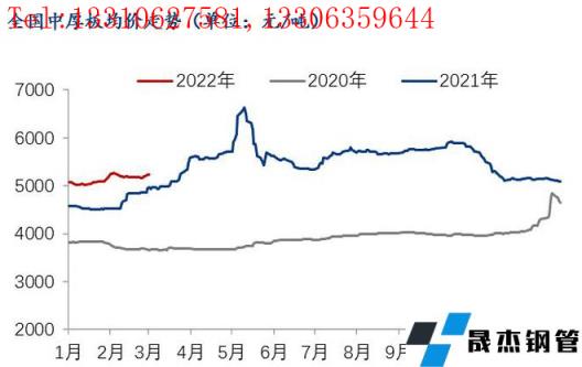 2021年的唐山限产是从3月份开始的,那么在2021年3月份之前这段时间里,全国中板的周产量达到了历史新高,平均每周产量在135-145万吨,在唐山限产政策出台过后,中板产量才开始出现了下滑。反观今年,由于冬奥会限产及采暖季限产,导致今年的限产其实是提前到了一月份,据我们统计的数据显示,2022年1-2月份中板平均周产量在120-124万吨,那这个产量水平相当于同比去年每周是减少了15-20万吨,降幅是10-15%;从这方面来看,也能够很好解释,为什么今年春节前后,华北地区的价格上涨趋势是又快又高,甚至高于华东地区价格,区域价差失衡。另一方面,从华东地区的调坯轧材无缝厚壁钢管厂家春节期间检修情况来看,今年的检修时长明显是比去年有延长,去年春节期间各调坯厂平均检修时长是7天,今年部分无缝厚壁钢管厂家受疫情原因影响,检修时长延长至9-20天,也是进一步导致华东地区普板资源紧俏的原因。