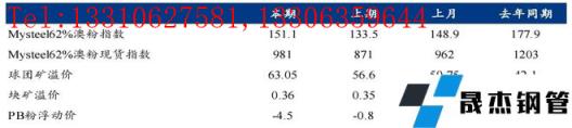 港口现货与远期现货方面:本周五62%澳粉指数151.1美元/吨,环比增加17.6美元/吨;62%澳粉现货指数981元/吨,环比增加110元/吨; 65%球团溢价指数为63.05美元/吨,环比涨6.45美元/吨; 62.5%块矿溢价指数0.36美元/吨度,环比上涨0.02美元/吨度。本周PB粉远期浮动溢价-4.5美元/吨,环比下跌3.70美元/吨。