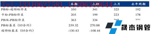 价差方面:本周高低品价差扩大,截至周五青岛港PB粉与超特粉价差350元/吨,环比扩大9元/吨;巴西矿溢价减少,青岛港卡粉与PB粉价差205元/吨,环比收窄6元/吨;粉块价差收窄,青岛港PB块与PB粉价差363元/吨,环比收窄29元/吨。期现基差方面:PB粉基差259.32,环比走弱11.56;超特粉基差-130.43,环比走弱21.99。