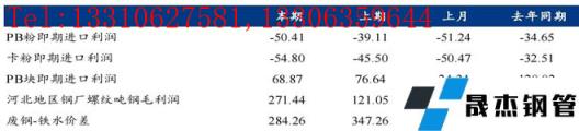 利润方面:截至周五,青岛港PB粉即期进口利润-50.41元/吨,环比下降11.3元/吨;青岛港卡粉即期进口利润-54.8元/吨,环比下降9.3元/吨;青岛港PB块即期进口利润68.87元/吨,环比下降7.76元/吨。本期河北地区无缝厚壁钢管厂家螺纹吨钢毛利润271.44元/吨,环比增加150.4元/吨,废钢与铁水价差284.26元/吨,环比收窄63元/吨。
