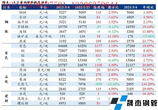 不锈钢:本周不锈钢价格呈现上涨趋势,受国际局势影响,全球金融及大宗商品市场出现大幅波动,镍价也屡创新高,不锈钢价格也同样出现较大幅度反弹,除了镍价带动,一方面有不锈钢现货市场成交红火支撑,另外近期消息面及部分无缝厚壁钢管厂家盘价上涨也对此有一定刺激。不锈钢价格反弹,现货成交明显转好,不锈钢社会库存年后首度出现下降。现阶段因国际局势影响,镍价大幅走高,其余不锈钢原材料价格也偏强,不锈钢成本方面仍有支撑,需求方面表现尚可,但暂未有旺季爆发体现,关注国际局势变化,警惕期货盘面高位回调,预计下周304价格窄幅震荡运行。