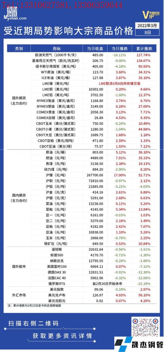 近期,受国际局势影响,全球金融及大宗商品市场出现较大波动。3月8日,伦敦金属交易所(LME)宣布暂停镍交易并取消当日早间已执行的镍交易,推迟了原定于3月9日的镍合约交割,伦镍“逼空”按下暂停键。汇总情况如下: