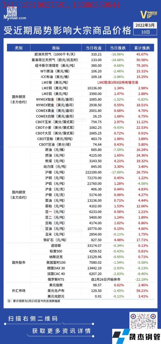 近期,受国际局势影响,全球金融及大宗商品市场出现较大波动。3月10日,国际能源价格继续大幅回落,沪镍主力合约恢复交易后跌停。汇总情况如下: