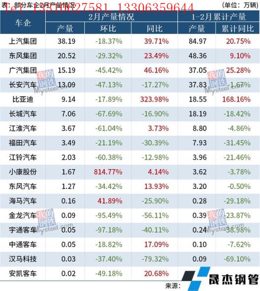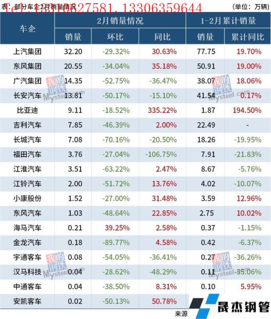 从同比上看,近半数车企2月产销量较上年同期有较大降幅,其中汉马科技产量下降79.32%;福田汽车销量同比下降106.75%。