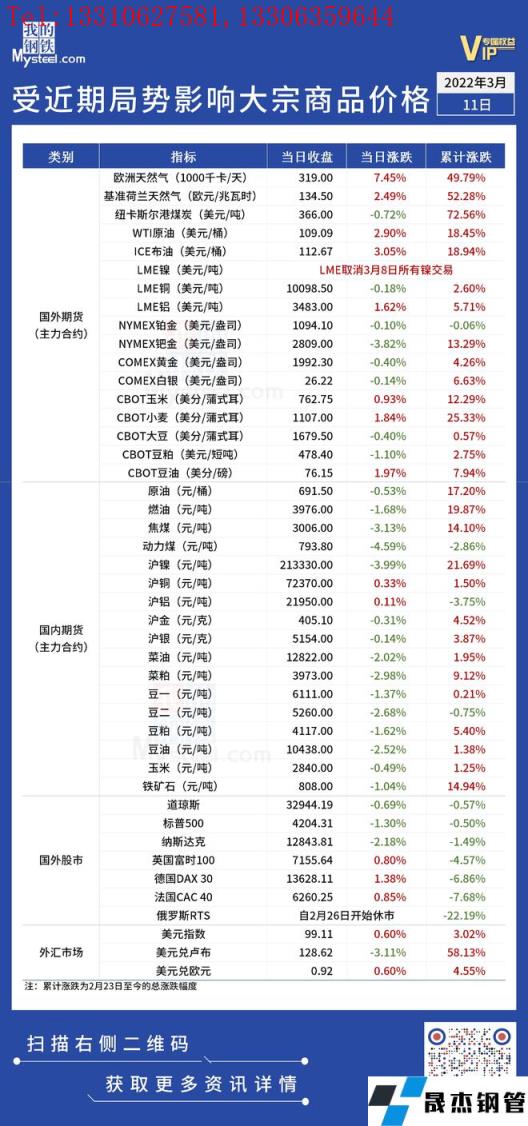 近期,受国际局势影响,全球金融及大宗商品市场出现较大波动。3月11日,商品及金融市场涨跌互现,波动幅度较前期明显收窄。汇总情况如下: