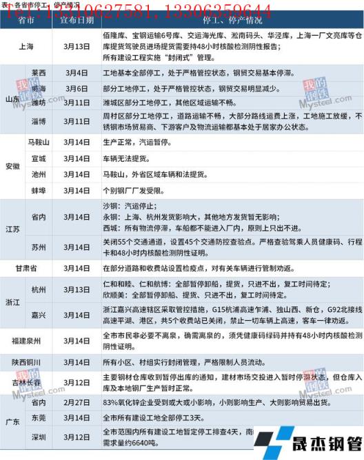 近期,全国疫情呈现局部高度聚集和多点散发态势,对国内大宗商品市场的供应端、需求端、物流及仓储等方面都有不同程度的影响。据统计,截至3月15日,全国多个省市发布停工停产情况。其中受疫情影响最大的吉林省于3月12日宣布,长春市主要厚壁无缝钢管仓库暂停出库,当地建材市场交投进入暂时停滞状态,仓库入库及本地无缝厚壁钢管厂家生产暂时正常。深圳市于3月12日宣布,全市范围内所有建设工地暂定停工排查4天,南山及福田区域厚壁无缝钢管市场预计共影响需求量约6640吨。与此同时,全国其他地区钢贸交易也受到影响,部分工地开始停工,物流运输暂停服务。具体情况如下: