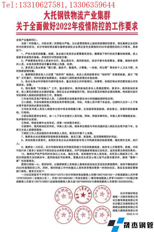 继3月14日长沙新增1例外省输入新冠病毒核酸检测初筛阳性后,相关部门已立即采取应急处置措施。据小编了解,为认真贯彻上级政府疫情防控要求,本地钢铁生产企业加强防控,层层核实人员情况,目前生产供应情况一切正常。厚壁无缝钢管市场交易活动有序进行,暂无工地受此影响停工。为防患于未然,长沙市厚壁无缝钢管商会联合集群各园区企业再次发布全面做好2022年疫情防控的工作要求,具体情况如下: