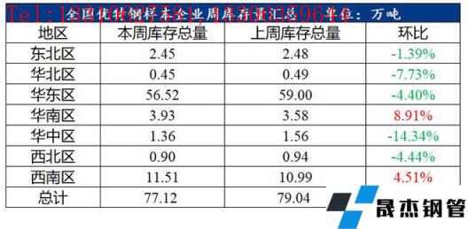 全国优特钢棒材样本总库存77.12万吨,环比下降1.92万吨,降幅2.43%。