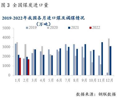 1-2月我国进口煤同环比大幅下降。2022年1-2月进口煤炭3539万吨,同比下降14.0%,降幅比上年12月份收窄6.9个百分点。主要是受印尼1月煤炭禁止出口政策影响,影响1月下旬以及2月中上旬我国煤炭进口到港,疫情影响我国288口岸蒙煤通关量下降至100车左右,导致1-2月我国煤炭进口量同比大幅回落。2月下旬海外地缘冲突爆发,短期对我国进口有一定影响,对2月影响体现不大。