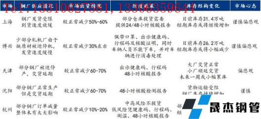 天津市场:近期疫情肆起,天津昨日新增本土病例51例,涉及区域偏多,范围偏广,部分无缝厚壁钢管厂家被迫停产,交货延期。各地交通受阻,据客户反馈,运费上涨幅度在20%左右。当地政策方面,全部返津人员实行查验“一证一码一卡”政策,即对来返津人员在铁路、机场、道路客运场站和公路通道卡口查验48小时核酸阴性证明、健康码绿码和通信行程卡。库存方面,目前大厂交货正常,商家到库资源在6-8成左右,小厂由于疫情资源无法正常交货,只能顺延交货。贸易商反馈疫情期间成交乏力,预计未来一周会出现小幅累库的现象。心态方面,由于近期疫情扩散较严重,且市场成交持续处于正常偏低水平,商家心态逐渐偏悲观。