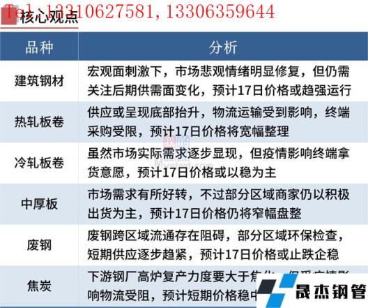 建筑厚壁无缝钢管:3月16日,全国31个主要城市20mm三级抗震螺纹钢均价4908元/吨,较上个交易日涨19元/吨。短期来看,在宏观消息刺激下,市场悲观情绪明显修复,或将带动现货市场迎来反弹,至于反弹高度,仍需关注后期供需面变化,如北方地区近期高炉集中复产以及疫情对于需求端的影响。因此预期17日国内建筑厚壁无缝钢管价格或将继续趋强运行为主。