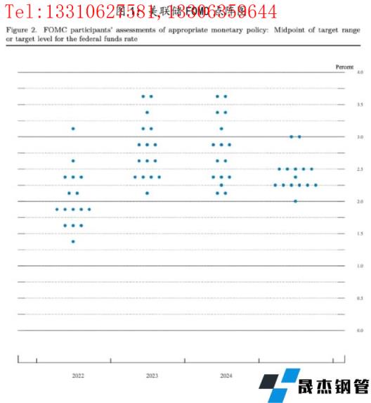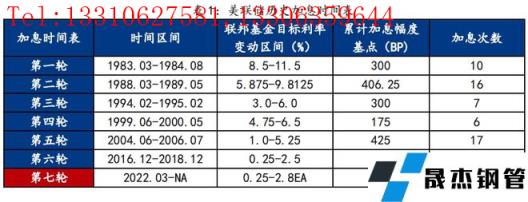从历史上来看(表1),美联储一共进行了6轮加息周期,虽然美联储基于同样的出发点为了控制通胀风险,维持经济稳步发展进行调控,但其中造成每次加息的因素多种多样,最早的时间可以追溯到1983年期间,美国在经济复苏的初期中通胀率达到了惊人的13.5%后美联储急需控制通胀率;也不乏在1999与2004年中为了对抗互联网泡沫以及房地产泡沫;在2016年第六轮加息中为了平衡前期充分的量化宽松。北京时间3月17日零点美联储第七轮加息正式落地,其中根据图1美联储FOMC点阵图做出的预判,本年度2022年加息次数将预计达到7次,并且在2023年底利率将达到2.8%。