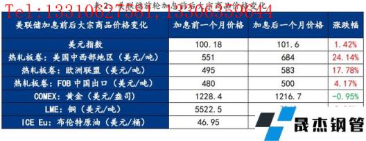 那么,在美联储历史上进行加息的时间区间中,大宗商品价格都是如何变化的呢?选取了美联储第六轮加息期间(2016.12-2018.12)美元指数、热轧板卷、黄金、铜、布伦特原油作为参考标的进行分析,其中参考时间维度为2016年加息落地前一个月的交易日价格与加息落地后一个月的交易日价格(表2)。