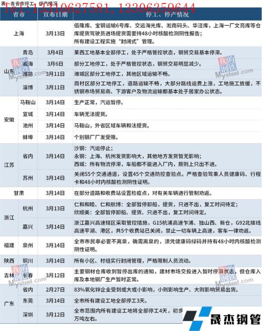 据统计,截至3月15日,全国多个省市发布停工停产情况。其中受疫情影响最大的吉林省于3月12日宣布,长春市主要厚壁无缝钢管仓库暂停出库,当地建材市场交投进入暂时停滞状态,仓库入库及本地无缝厚壁钢管厂家生产暂时正常。深圳市于3月12日宣布,全市范围内所有建设工地暂定停工排查4天,南山及福田区域厚壁无缝钢管市场预计共影响需求量约6640吨,深圳全市范围初步预计共影响建筑厚壁无缝钢管需求量约6万吨。与此同时,全国其他地区钢贸交易也受到影响,部分工地开始停工,物流运输暂停服务。具体情况如下: