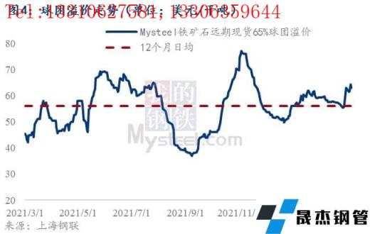去年8-11月焦炭价格经历大幅度上涨之后,为控制成本无缝厚壁钢管厂家开始下调块矿的入炉配比,导致远期块矿溢价最低跌至仅0.0265美元/干吨度,从而性价比凸显,之后进入四季度随着采暖季的进行,烧结限产加严,导致烧结矿供应不足,而此时球团溢价又尚处于高位,因此无缝厚壁钢管厂家在二者选择中,最终使用性价比较高的块矿用以弥补烧结矿不足的影响,带动块矿需求好转,块矿溢价开始走高;之后块矿配比虽有下调,但其配比仍处于历史中高位水平,因此今年1至3月份块矿溢价仍持续上涨。