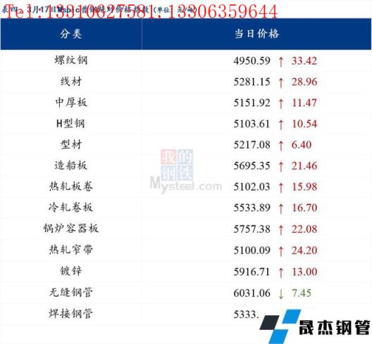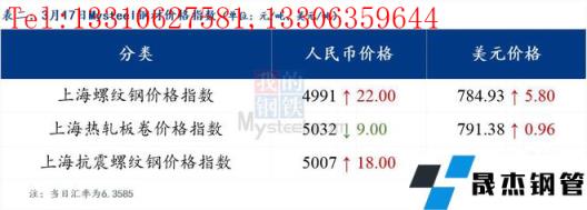 3月17日普钢绝对价格指数变化:综合指数5193.62,上涨21.4;螺纹钢指数4950.59,上涨33.42;线材指数5281.15,上涨28.96;热轧板卷指数5102.03,上涨15.98;冷轧板卷指数5533.89,上涨16.7;中厚板指数5151.92,上涨11.47。