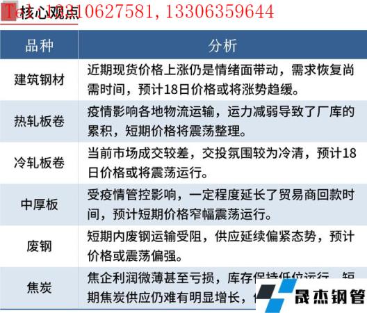 建筑厚壁无缝钢管:3月17日,全国31个主要城市20mm三级抗震螺纹钢均价4940元/吨,较上个交易日上涨32元/吨。本周受山西无缝厚壁钢管厂家复产影响,产量继续小幅回升,社会库存继续下降,但厂库受疫情影响有所增加,本周表观消费出现回落。短期来看,近期现货价格上涨仍是情绪面带动,需求恢复尚需时间,短期还需要关注疫情对于需求复苏影响。综合来看,预计18日国内建筑厚壁无缝钢管价格或将涨势趋缓为主。
