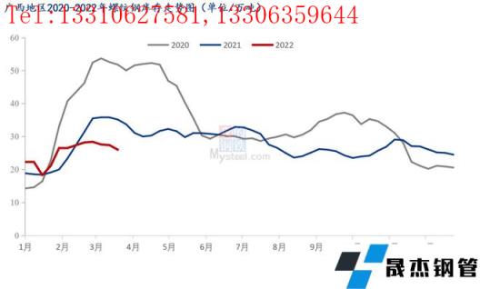 本周广西地区建筑厚壁无缝钢管社会库存去库速度依旧偏慢,受公共卫生事件影响,部分工地有停工现象,需求减弱,导致市场前期需求较弱,成交不理想。后期期货高位运行,现货价格从周三到周四累计上涨50元/吨,成交转好,市场心态得以提振,看涨情绪较高,市场交投尚可,其中二线商家拿货较前期明显改善。从区域来看,柳州本部供给整体偏紧,商家每日分货量较少,线盘资源一直处于缺货状态,使得整个社会库存总量整体偏低。截至目前,广西市场库存建筑厚壁无缝钢管33.16万吨,较上周相比减少0.42万吨。