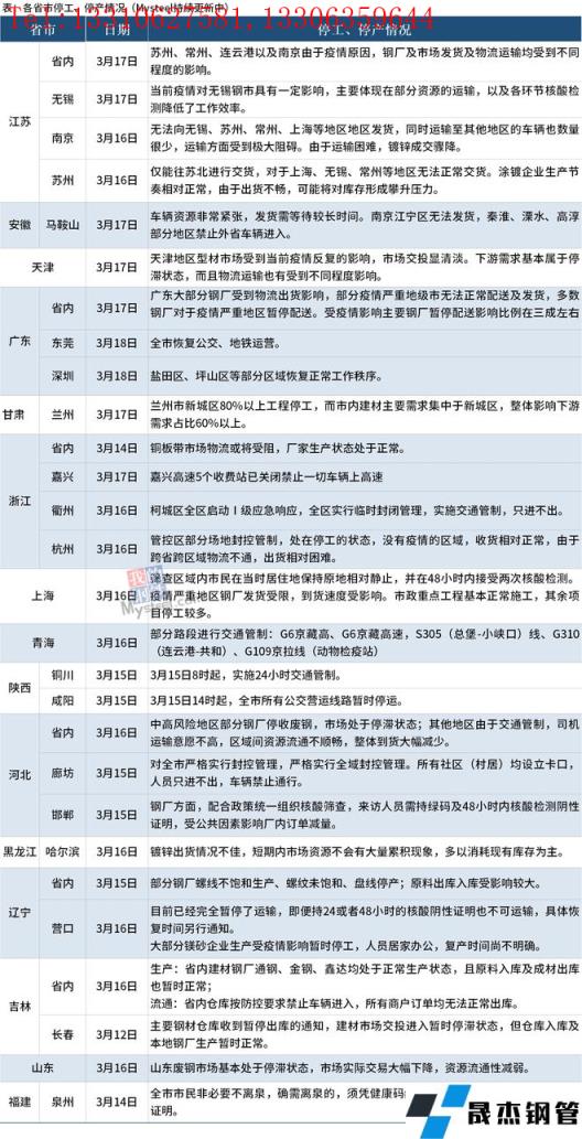 截至3月18日,汇总了15个省份停工停产最新信息。其中,江苏省内苏州、常州、连云港以及南京由于疫情原因,无缝厚壁钢管厂家及市场发货及物流运输均受到不同程度的影响。安徽省内出现车辆资源非常紧张,发货需等待较长时间等情况,无法向南京江宁区发货,秦淮、溧水、高淳部分地区禁止外省车辆进入。广东省大部分无缝厚壁钢管厂家受到物流出货影响,部分疫情严重地级市无法正常配送及发货,多数无缝厚壁钢管厂家对于疫情严重地区暂停配送。受疫情影响主要无缝厚壁钢管厂家暂停配送影响比例在三成左右;东莞全市恢复公交、地铁运营;深圳盐田区、坪山区等部分区域恢复正常工作秩序。具体情况如下: