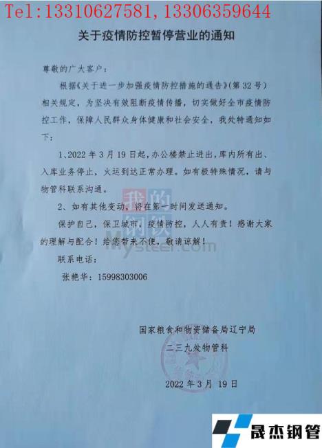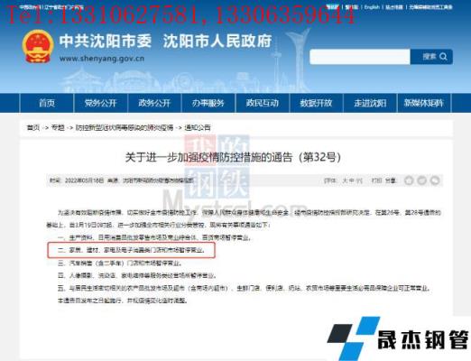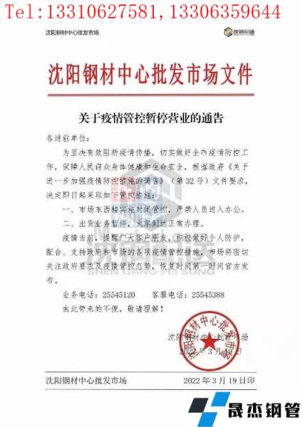 目前沈阳厚壁无缝钢管中心批发市场已发布通告,19日起北一西路东西楼试试封闭管控、严禁人员进入办公,出库业务暂停、火车到达正常办理;中国兵工物资125库通告19日起严禁人员进入库区办公,出库业务暂停、火车到达正常办理;国家粮食和物资储备局辽宁局二三九处通告19日起办公楼严禁进出,库内所有出入库业务暂停、火运到达正常办理。市内其他主要厚壁无缝钢管市场反馈暂时正常办公及出库,但从防控指挥部通告内容来看、也有暂停营业的倾向。(通告见文末图片)
