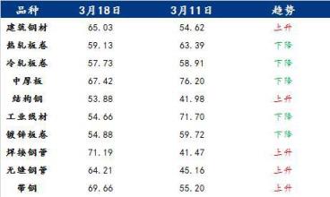 具体各品种指数来看,3月18日建筑厚壁无缝钢管情绪指数为65.03,较3月11日回升10.41;热轧板卷情绪指数为59.13,较3月11日回落4.26;冷轧板卷情绪指数为57.73,较3月11日回落1.18;中厚板情绪指数为67.42,较3月11日回落8.78;结构钢情绪指数为53.88,较3月11日回升11.9;工业线材情绪指数为54.66,较3月11日回落17.04;镀锌板卷情绪指数为54.88,较3月11日回落4.84;焊接厚壁钢管情绪指数为71.19,较3月11日回升29.72;无缝厚壁钢管情绪指数为64.21,较3月11日回升19.05;带钢情绪指数为69.66,较3月11日回升14.46。