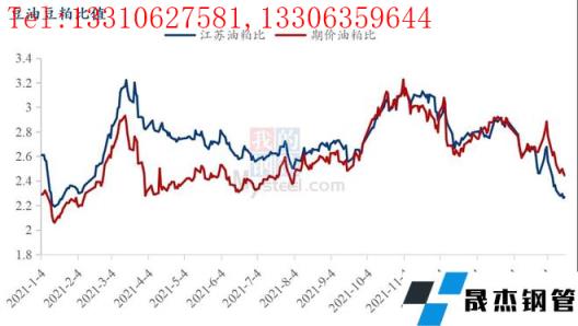 其六:3月份以来豆油价格见高回落,豆粕价格被动变得更加坚挺。3月初,豆粕期现货价格双双创出阶段性高位后出现一轮回撤走势。从下图油粕比走势来看,2022年3月3日,江苏地区现货豆油豆粕比值2.68,期价主力合约豆油豆粕比值2.88;截止3月18日,江苏地区现货豆油豆粕比值下降至2.27,期价主力合约豆油豆粕比值下降至2.44。期间外围CBOT大豆价格整体高位盘整为主,因此豆粕估值获得被动提升。