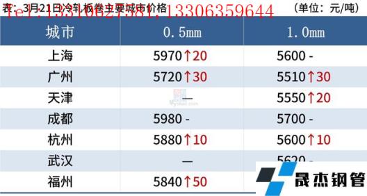 冷轧板卷:3月21日,全国24个主要城市1.0mm冷卷均价5646元/吨,较上个交易日上涨11元/吨。据局部区域贸易商反馈,今日市场交投情绪略有好转,商户多以出货兑现为主,中小贸易商逢低补货,下游行业订货量有所增加;近日无缝厚壁钢管厂家资源陆续倒库,库存压力偏大,东南地区主流市场库存偏高;心态面看,目前贸易商心态多谨慎偏悲观,短期公共卫生事件对需求影响较大,冷轧将呈现持续累库状态。综合来看,预计22日全国冷轧现货价格窄幅波动为主。