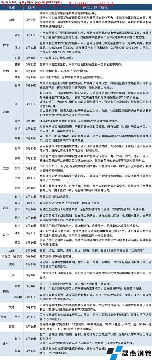 截至3月22日,汇总了16个省份停工复工最新信息。其中,湖南省本地钢企对废钢送货车辆管控有所升级;主流废钢基地疫情管控措施与此前相比变化不大,多数基地正常加工出货,部分基地对进厂车辆管控较前期有所升。唐山长流程无缝厚壁钢管厂家目前整体生产情况正常,但受全域交通临时管控影响,依靠汽运原料进厂及成品材出厂严重受阻,个别无缝厚壁钢管厂家已有由于原料短缺导致高炉停产的情况发生。山东省已有青岛、烟台、日照、德州、潍坊、威海、淄博、临沂8个市实现社会面“动态清零”。具体情况如下: