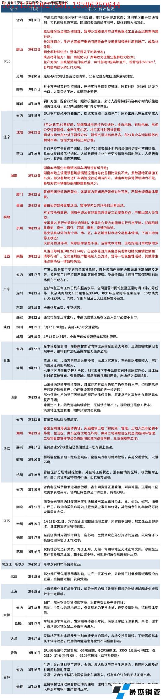 其中,3月22日,唐山市启动临时性全域封控管理,暂停办理和使用市县两级重点工业企业运输车辆通行证。沈阳于3月24日至30日期间,除保障城市运行的交通外,全市地铁、有轨电车、常规公交运营暂停,全市住宅小区、村屯实行封闭式管理;厚壁无缝钢管市场大部分处于暂停办公、暂停汽运进出库状态,部分有火车运输服务的厚壁无缝钢管市场、仓储火运到达正常办理。3月20日福建泉州安溪县开始采取交通管制,除安溪县以外的各个县、市、区,本区域厚壁无缝钢管市场交易基本停滞,下游工地待停工状态。具体情况如下: