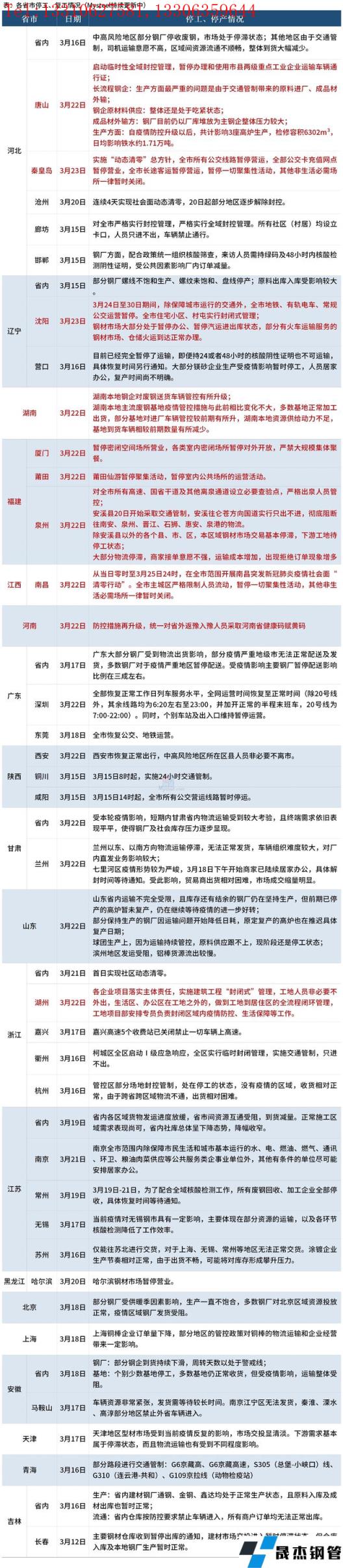 其中,3月22日,唐山市启动临时性全域封控管理,暂停办理和使用市县两级重点工业企业运输车辆通行证。沈阳于3月24日至30日期间,除保障城市运行的交通外,全市地铁、有轨电车、常规公交运营暂停,全市住宅小区、村屯实行封闭式管理;厚壁无缝钢管市场大部分处于暂停办公、暂停汽运进出库状态,部分有火车运输服务的厚壁无缝钢管市场、仓储火运到达正常办理。3月20日福建泉州安溪县开始采取交通管制,除安溪县以外的各个县、市、区,本区域厚壁无缝钢管市场交易基本停滞,下游工地待停工状态。具体情况如下: