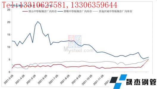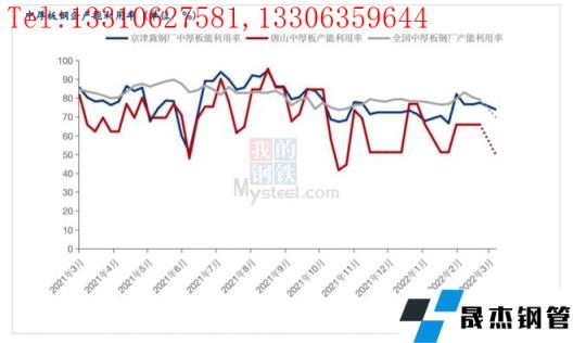 由于前期京津冀地区受到“2+26”座城市秋冬季限产、冬残奥会限产等政策,产能利用率出现了明显的下滑。随着采暖季的结束以及东残奥会的闭幕,钢企的产能利用率出现了回升,截至3月18日,全国中厚板钢企产能利用率79.13%,京津冀地区中厚板钢企产能利用率77.55%,唐山地区中厚板钢企产能利用率为65.53%,随着3月19日唐山疫情突发,无缝厚壁钢管厂家的复产节奏与物流均受到了影响,当下原料供给是当下比较棘手的问题,短期内炉料补给不足,钢企被迫停产的可能性较大。预计3月底,唐山中厚板产能利用率或将大幅下降,全国中厚板钢企产能利用率预计在70%左右。