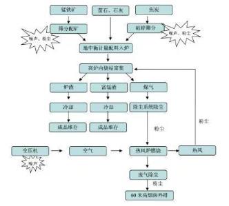 富锰渣生产线整个工艺系统由原材料入厂、储存、电子称称量、皮带输送机上料、布料小车布料、高炉还原冶炼、铁水包,成品入库及成品发放等组成。在生产过程中排出大量的高温含尘烟气,烟气主要成份是煤气,所产生的烟尘是要是炉尘和瓦斯泥。