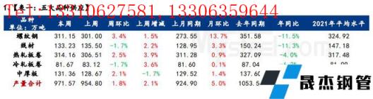 供应方面,本周五大厚壁无缝钢管品种供应增至971.57万吨,增量16.77万吨,增幅1.8%,其中建材环比增量7.9万吨,增幅1.8%,板材环比增量8.89万吨,增幅1.7%。