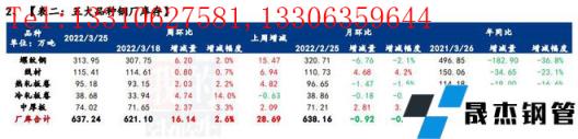 库存方面,五大品种厚壁无缝钢管总库存节后第3周转增,环比上周微增1.16万吨,增幅0.05%。分品种看,建材库存增加2.84万吨,增幅为0.2%;板材库存减少1.68万吨,降幅0.2%;分指标看,五大品种无缝厚壁钢管厂家库存环比增加16.14万吨,增幅2.6%;五大品种社会库存环比减少14.98万吨,降幅0.9%。