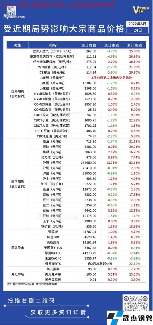 近期,受国际局势影响,全球金融及大宗商品市场出现较大波动。3月24日,国际油价、能源价格下跌,伦敦金属交易所(LME)表示,3月24日镍的第二场场内交易将被视为受到干扰,该交易期间达成的所有交易将无效。汇总情况如下: