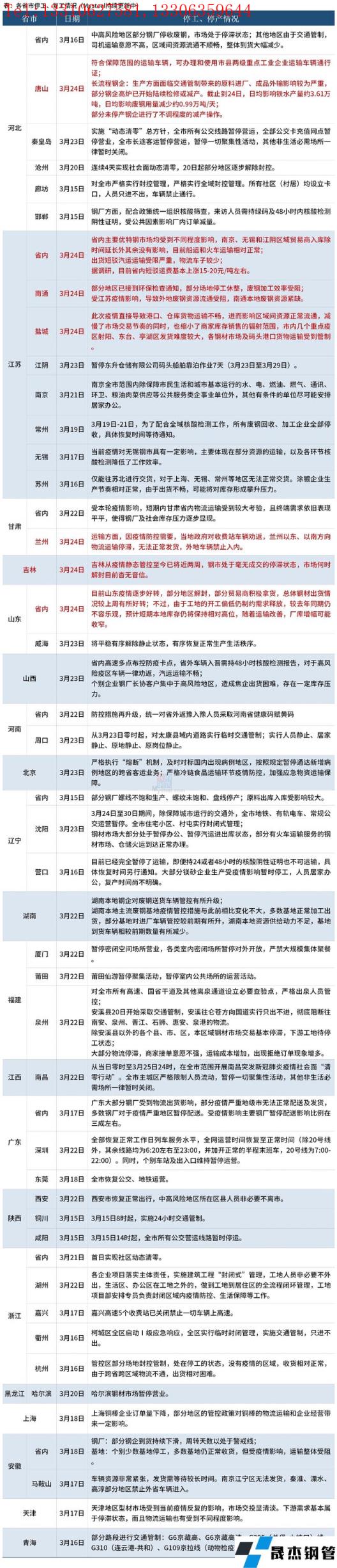 截至3月25日,汇总了20个省份停工复工最新信息。其中,河北唐山市符合保障范围的运输车辆,可办理和使用市县两级重点工业企业运输车辆通行证。江苏南通部分地区已接到环保检查通知,部分场地停工休整,废钢加工效率受阻。吉林从疫情静态管控至3月24日将近两周,钢市处于毫无成交的停滞状态,市场何时解封目前杳无音信。具体情况如下: