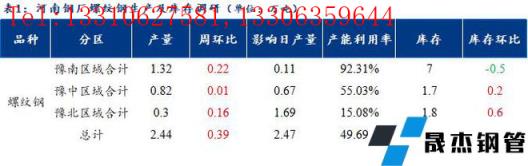 1、调研数据显示,统计的河南地区10家建筑厚壁无缝钢管样本无缝厚壁钢管厂家中,河南省建材无缝厚壁钢管厂家螺纹钢日产量2.44万吨;检修/限产影响建材日产量为2.47万吨,产能利用率为49.69%,较上周上升7.94%。