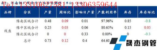 1、调研数据显示,统计的河南地区10家建筑厚壁无缝钢管样本无缝厚壁钢管厂家中,河南省无缝厚壁钢管厂家线盘日均产量0.73万吨,较上周小幅增加0.12万吨;检修/限产影响建材日产量为0.4万吨,产能利用率64.6%,较上周上升10.62%。