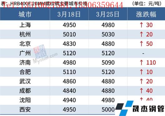 截至3月25日,全国主要城市20mm三级抗震螺纹钢均价4990元/吨,周环比上涨35元/吨;8.0mmHPB300高线均价5196元/吨,周环比上涨34元/吨。